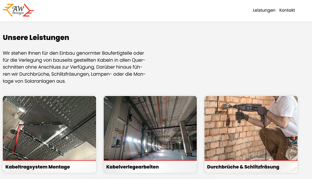 Für Awessel Montage wurde eine schlichte, übersichtliche Website erstellt, die den Fokus klar auf die Präsentation der Leistungen legt. Dank Kontaktformular auf jeder Seite können Kunden unkompliziert und schnell Kontakt aufnehmen.