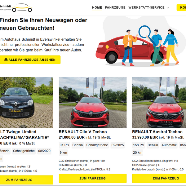 Für das Autohaus Schmidt in Everswinkel haben wir eine Website entwickelt, die den Fahrzeugverkauf auf ein neues Level hebt. Durch die direkte Anbindung an das mobile.de-Konto werden Inserate automatisch übernommen – ganz ohne doppelten Pflegeaufwand. So bleibt die Seite immer aktuell, sichtbar in den Suchmaschinen und bringt mehr Anfragen direkt zum Autohaus.