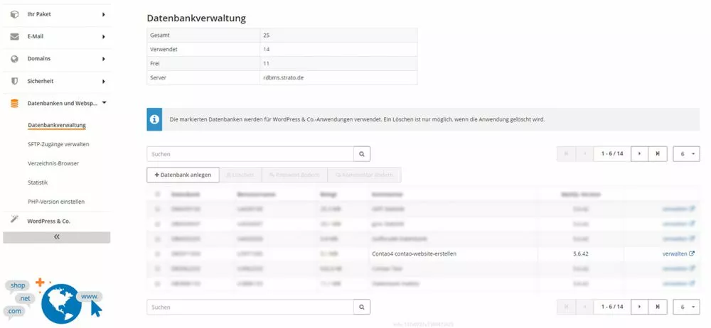 In diesem Beispiel befindet sich die Contao-Instanz auf dem Server von Strato. Um dich in deine Datenbank einzuloggen, benötigst du zunächst die Zugangsdaten von deinem Hoster. Um auf phpMyAdmin zuzugreifen, navigiere zu »Datenbanken und Webspace«, dann zu »Datenbankverwaltung« und klicke schließlich auf »verwalten« bei der entsprechenden Datenbank.