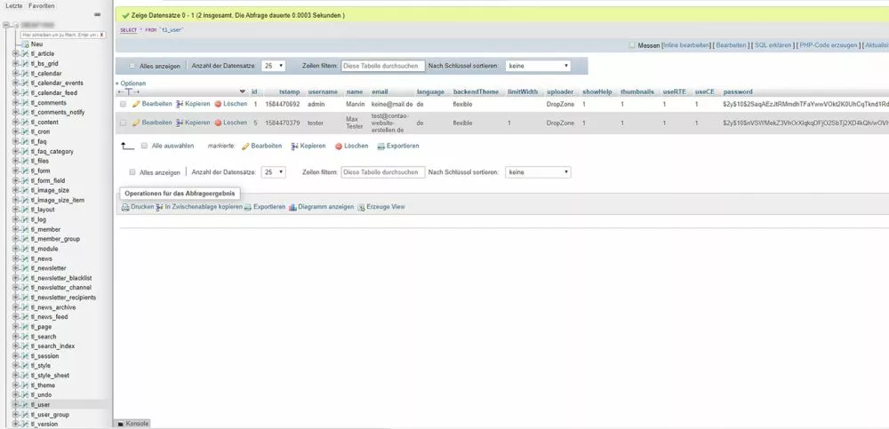 Die Benutzeroberfläche von phpMyAdmin variiert je nach Version ein wenig, aber die grundlegenden Funktionen bleiben stets gleich. Sobald du dich in der Datenbankverwaltung befindest, wählst du in der linken Spalte den Tabellensatz "tl_user" aus. Das Präfix "tl_" kann sich je nach Konfiguration unterscheiden (zum Beispiel contao_user oder andere Varianten). Um die richtige Tabelle zu finden, kannst du die Tastenkombination STRG + F in deinem Browserfenster verwenden und nach dem Ausdruck "_user" suchen.