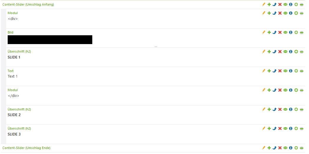 Im ersten Schritt legst du ein Inhaltselement vom Elementtyp "Umschlang Anfang" aus der Gruppe Content Slider an und fügst einen beliebigen Inhalt ein. Nach dem letzten Element fügst du - du kannst es dir bereits denken - ein "Umschlang Ende", ebenfalls aus der Gruppe Content Slider, ein. Du kannst dazu bereits jetzt so viele Texte und Bilder einfügen, wie es dir beliebt. Logischerweise werden die Elemente nun aktuell noch Slide für Slide angezeigt. Um diesen Umstand zu ändern, werden wir nun Module erstellen, mit denen wir selbst definieren, wann ein Slide endet und ein neuer anfängt.