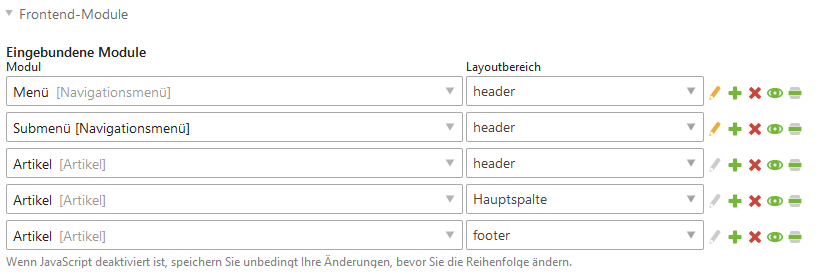 Sobald du deine Module erstellt hast, musst du sie an entsprechender Stelle im Seitenlayout einbinden. Navigiere dazu auf Layout » Themes und wähle das Icon mit dem dreigeteilten Blatt “Seitenlayouts bearbeiten”, klicke beim entsprechenden Layout auf den Stift und scrolle zum Bereich Frontend-Module. Dort kannst du nun im Layoutbereich “header” auf duplizieren klicken und das Modul “Menü” ganz nach oben schieben. Im Falle der Alternativlösung fügst du das Modul Submenü drunter ein.