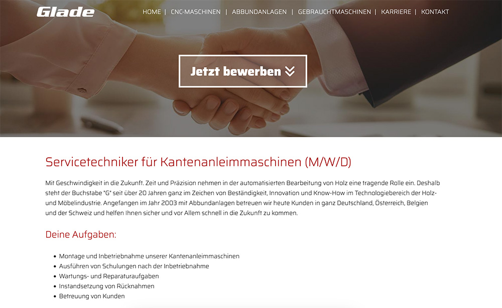 Für den Website-Relaunch von Glade CNC lag der Fokus auf einer filterbaren Produktdatenbank für präzise Maschinenübersicht sowie einem Karriereportal, das Bewerbungen direkt online ermöglicht und Redakteuren volle Kontrolle bietet.