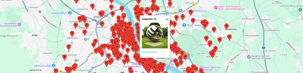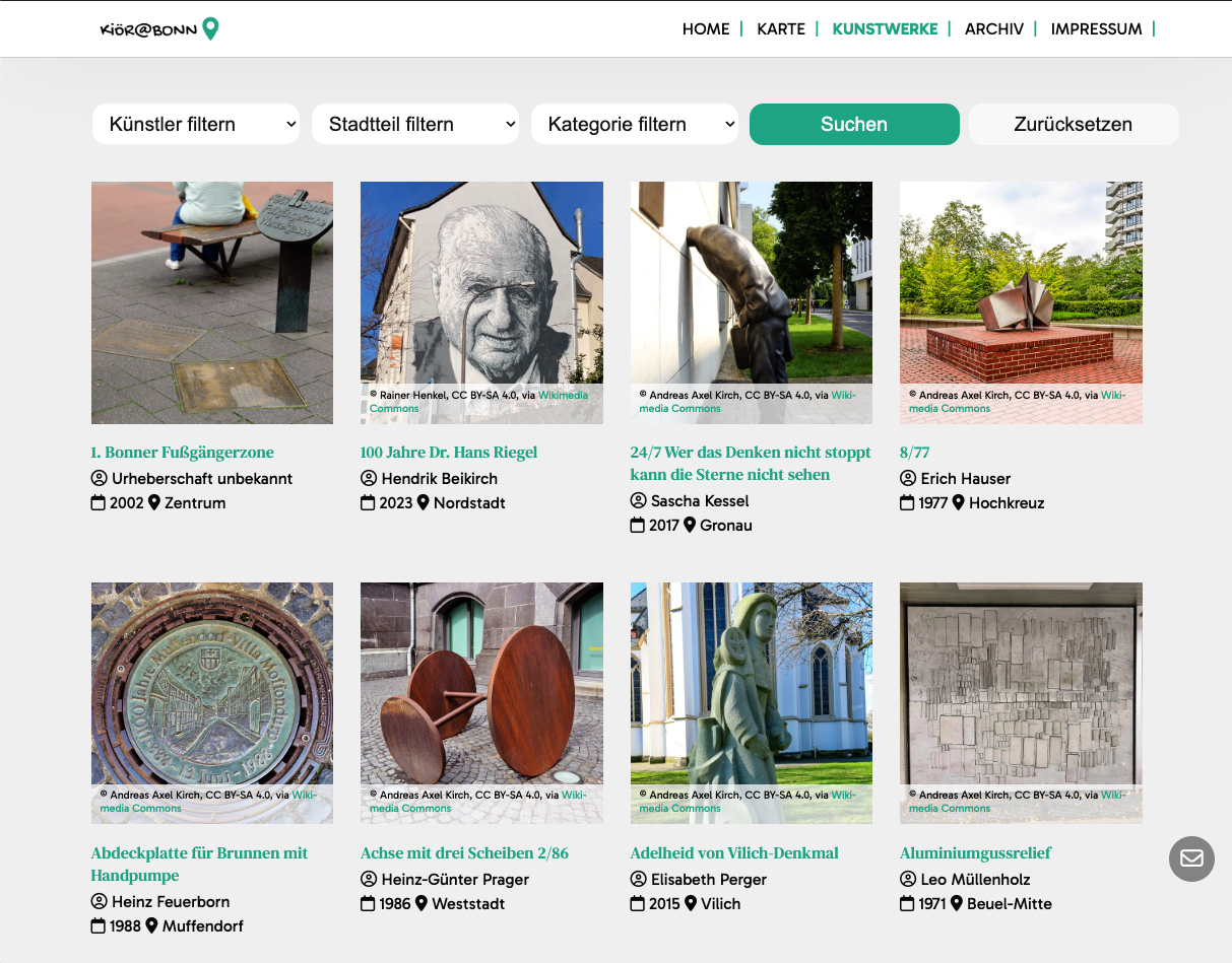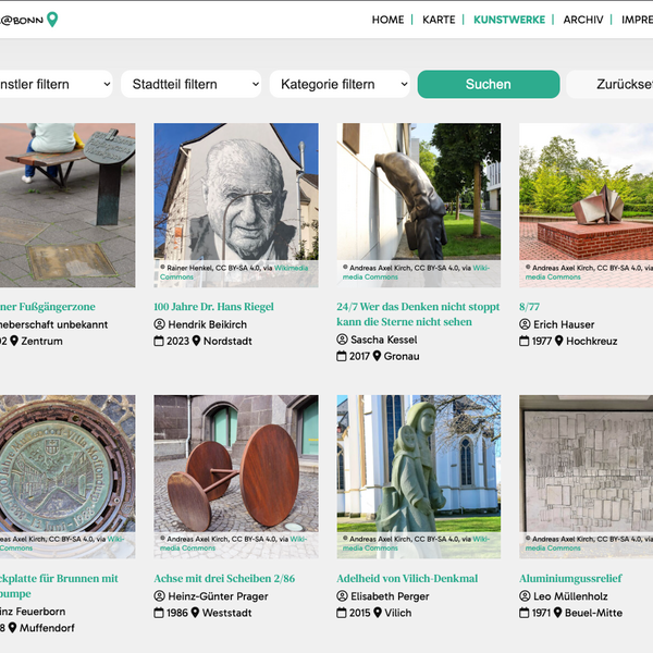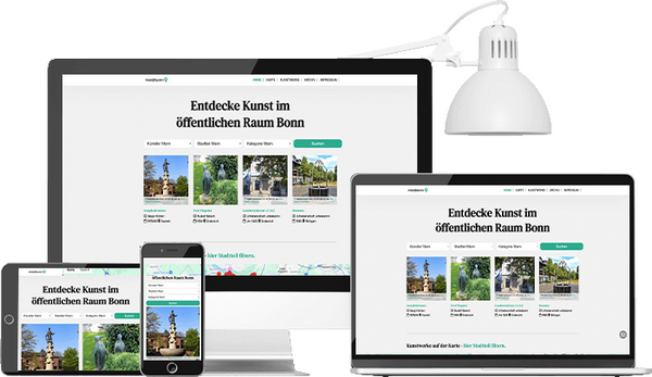 Für das Projekt „Kunst im öffentlichen Raum Bonn“ entstand eine mobilfreundliche Website, auf der Besucher:innen gezielt nach Kunstwerken suchen können. Eine interaktive Karte und intelligente Filterfunktionen machen das umfangreiche Kunstarchiv intuitiv zugänglich – für Bürger:innen, Touristen und Kulturinteressierte gleichermaßen.