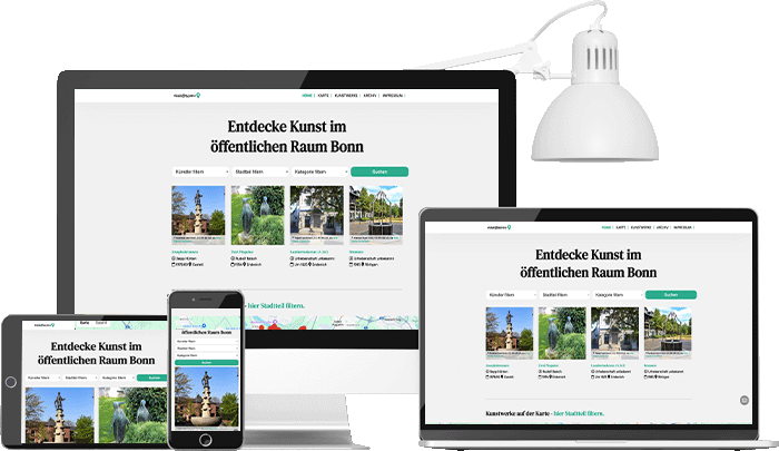 Für KiöR Bonn entstand eine Website, die urbane Kunst digital sichtbar und durchsuchbar macht. Mit interaktiver Karte und Suchfunktion mit Filter.